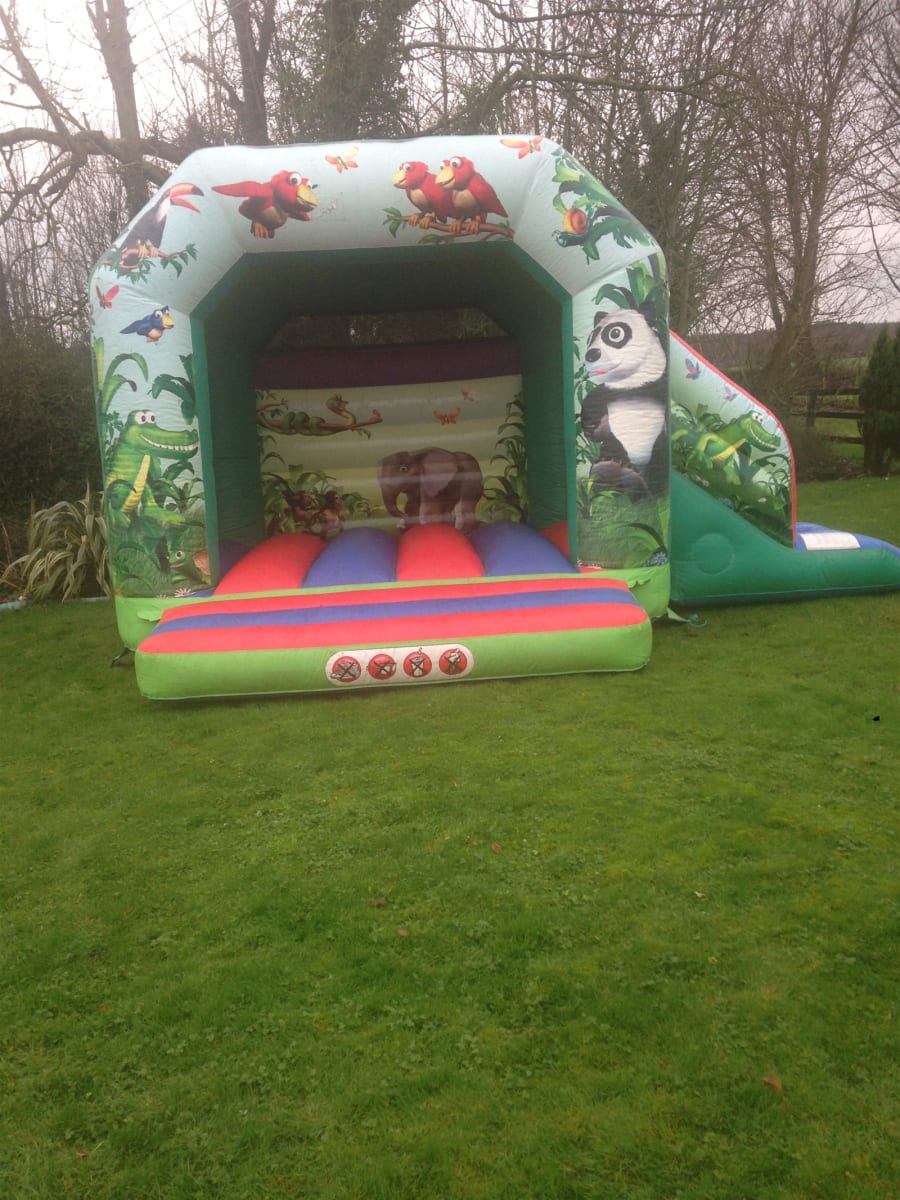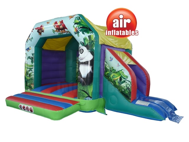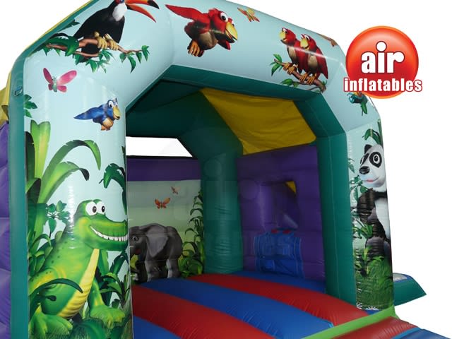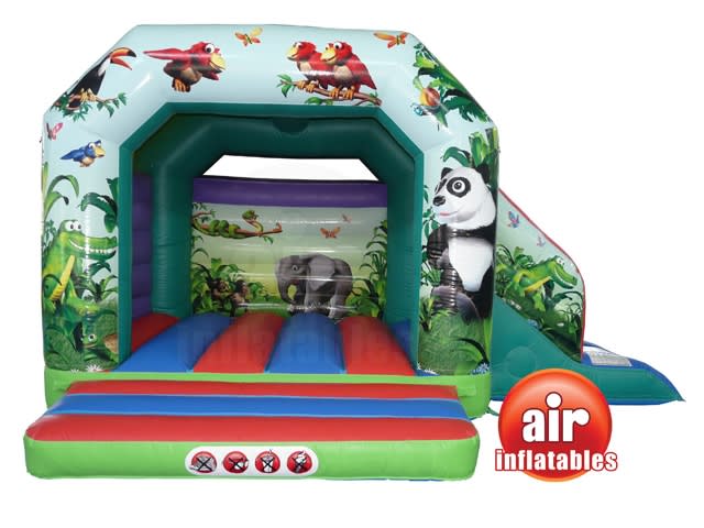 A fully featured Bounce and Slide combo with a sewn in cover, deep bounce bed, netted windows & stunning eye catching 3D Jungle Artwork Theme both inside and on the front. Designed to fulfil the bouncing dreams of any child.