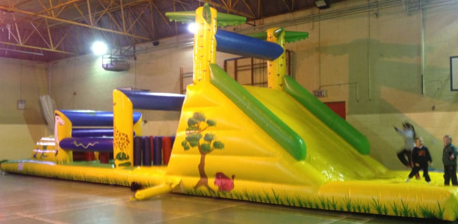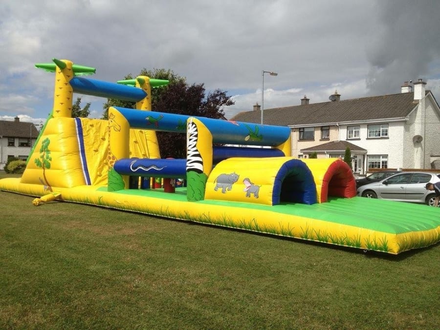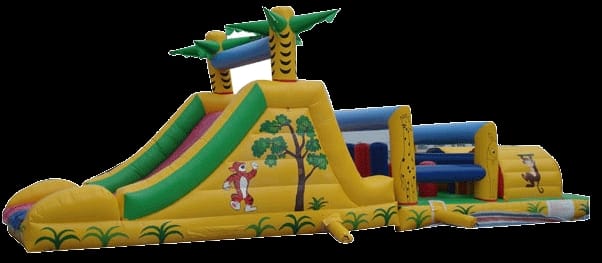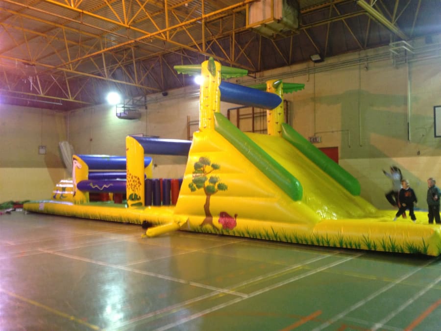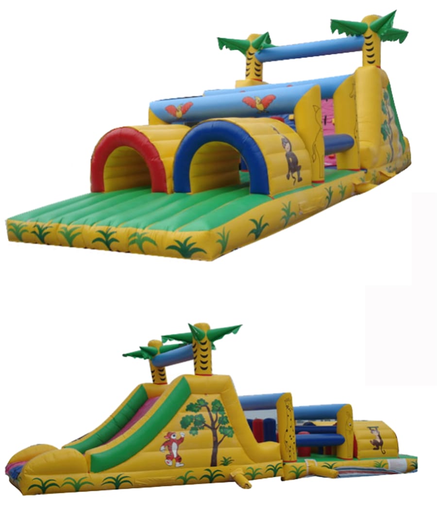 This is an impressive inflatable obstacle course bouncy castles unit with a jungle theme. It features tunnels, biff and bash inflatable obstacle courses and a slide.