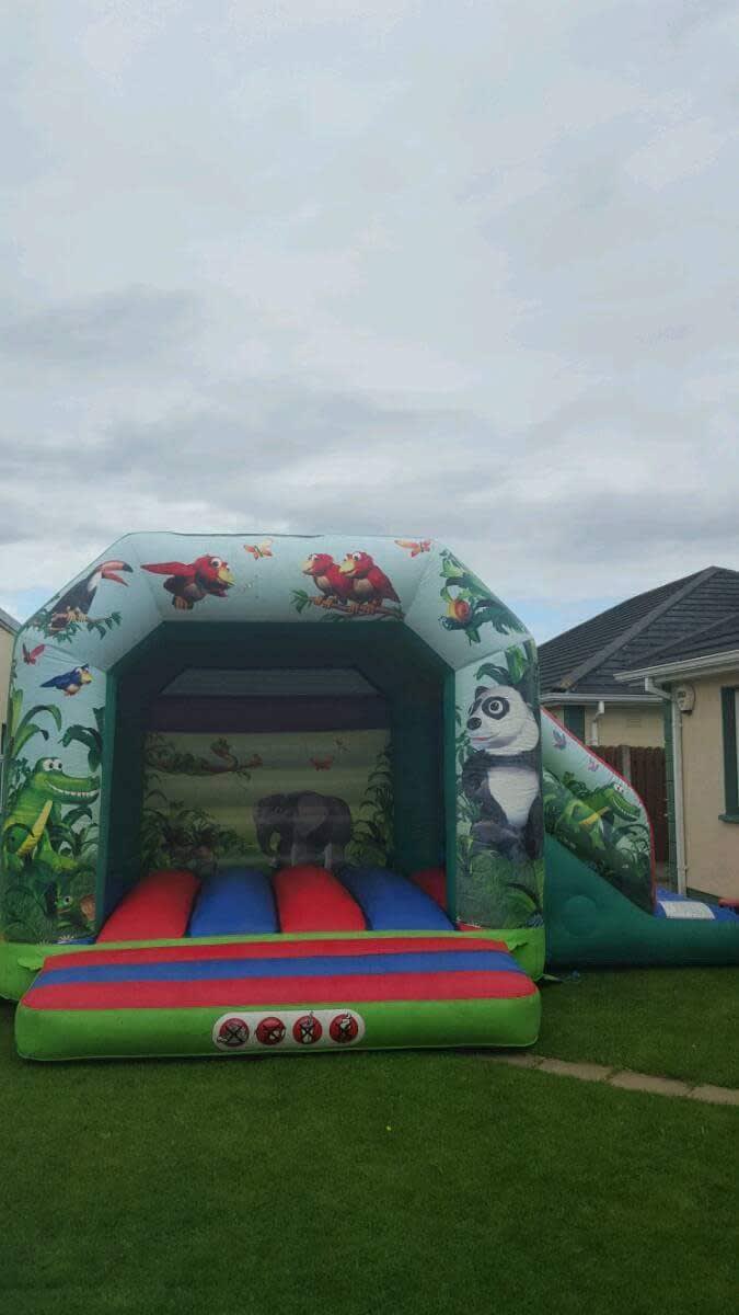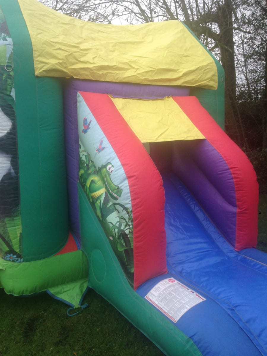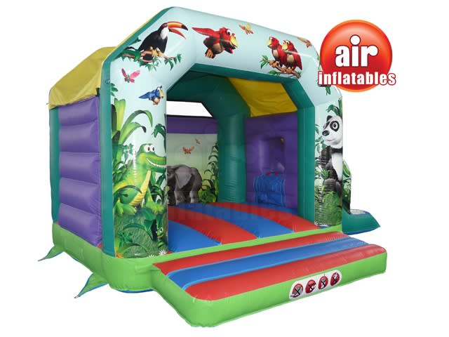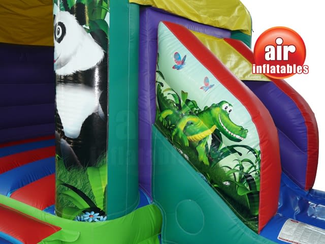 A fully featured Bounce and Slide combo with a sewn in cover, deep bounce bed, netted windows & stunning eye catching 3D Jungle Artwork Theme both inside and on the front. Designed to fulfil the bouncing dreams of any child.
