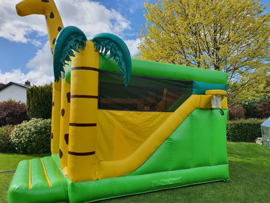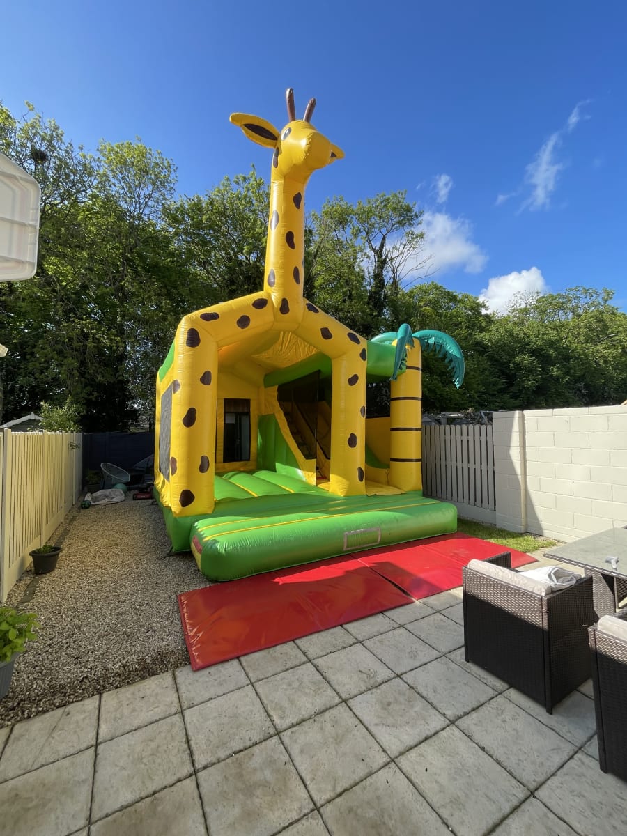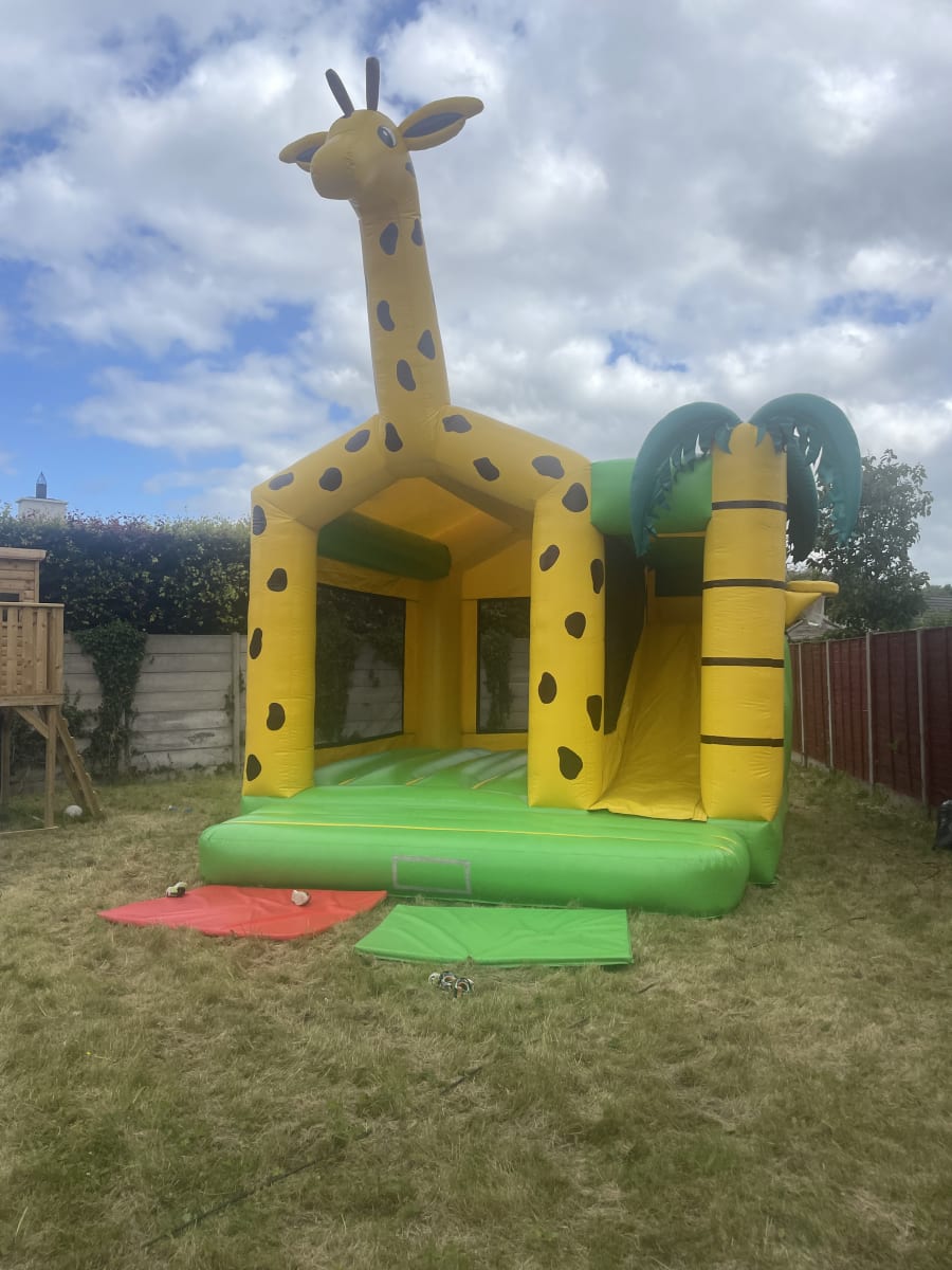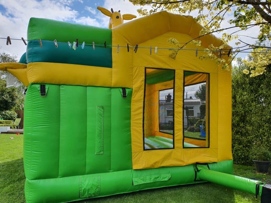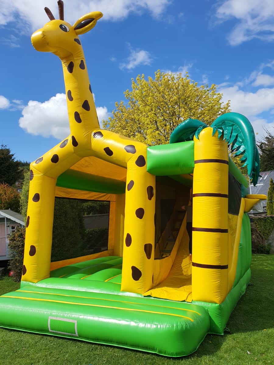 This castle was only introduced to our range of inflatables and instantly became a hit with all children. With impressive artwork and the massive Giraffe inflatable head on the roof, this castle certainly stands out. It comprises of a large bouncy area with biff and bash blow-ups inside, a side slide and a rain cover. This really is a fun inflatable and is guaranteed to provide hours and hours of endless fun.