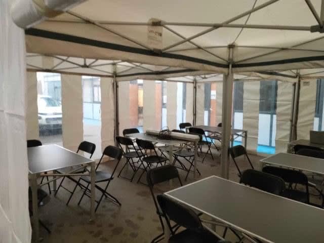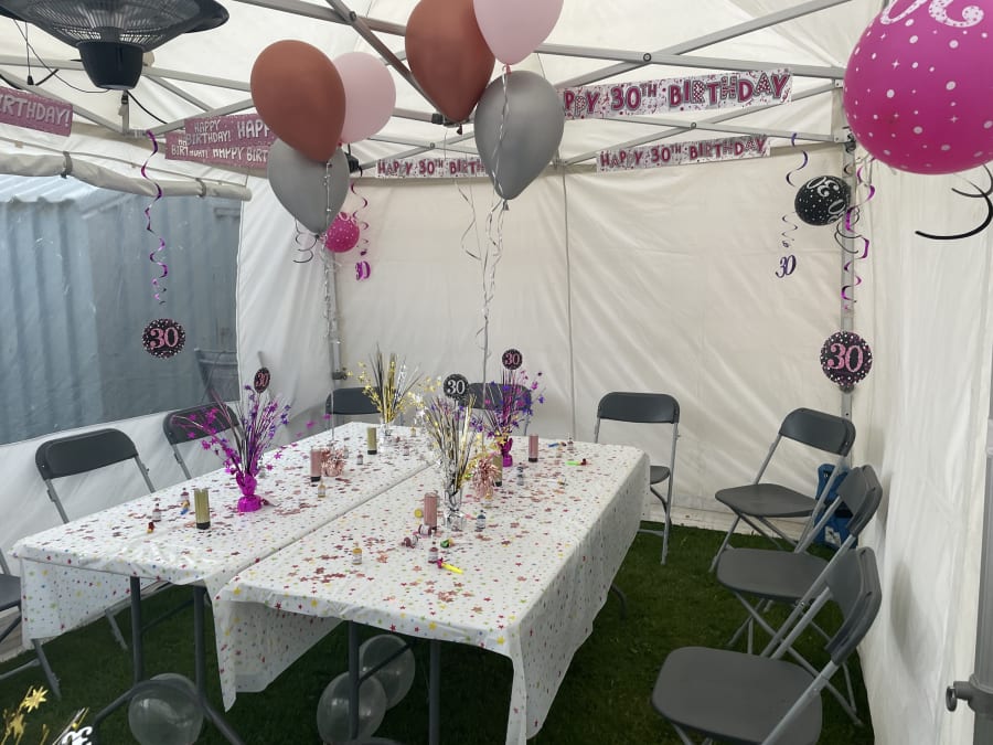 We can supply floor, seating, tables, lighting, Heaters, Disco Lights, lining at request.