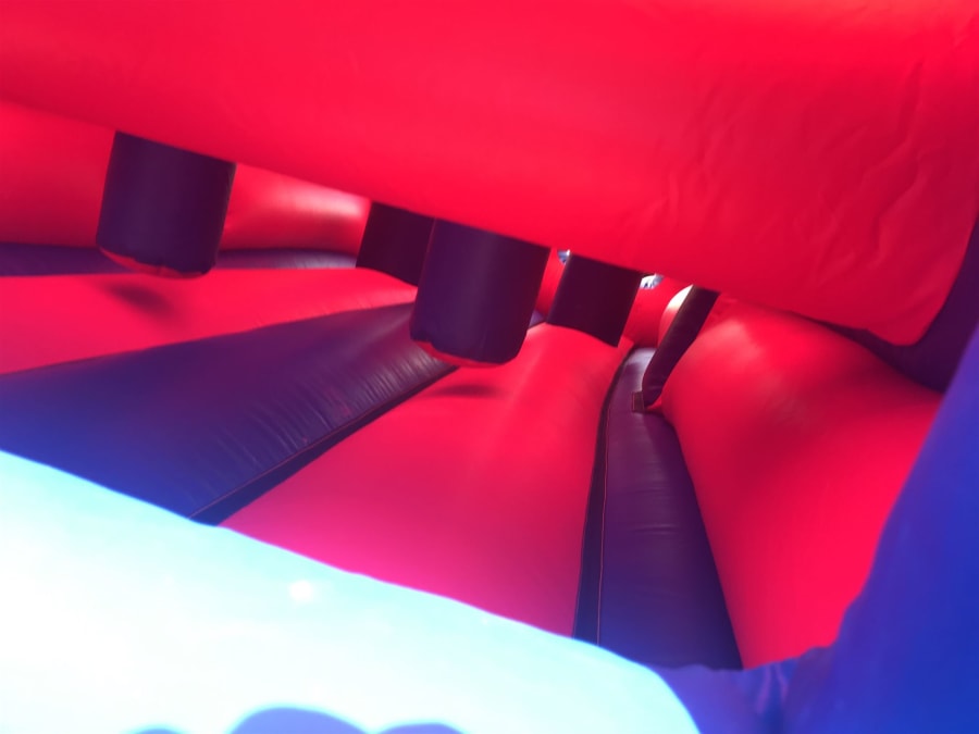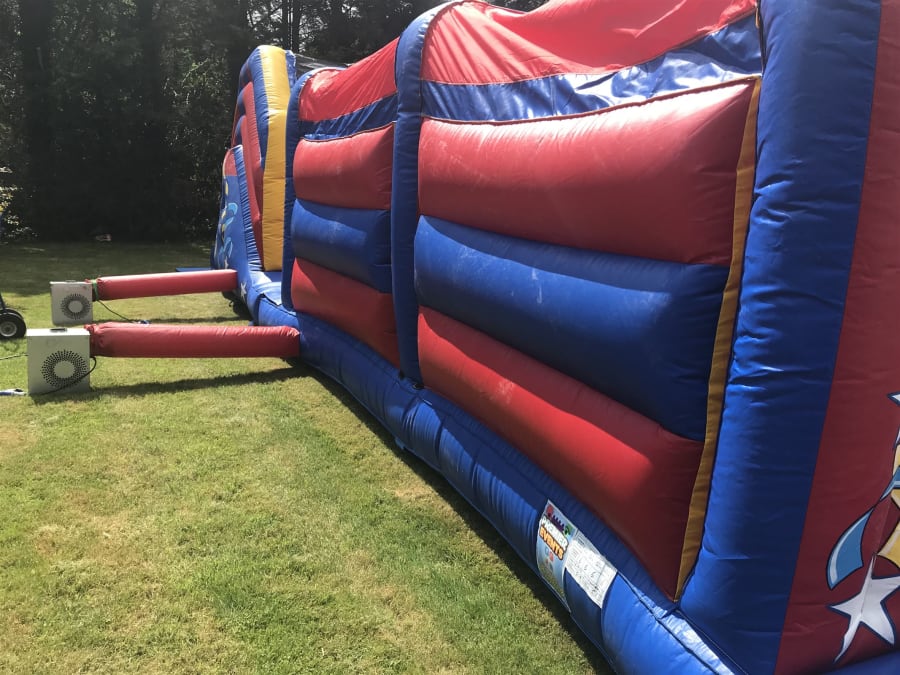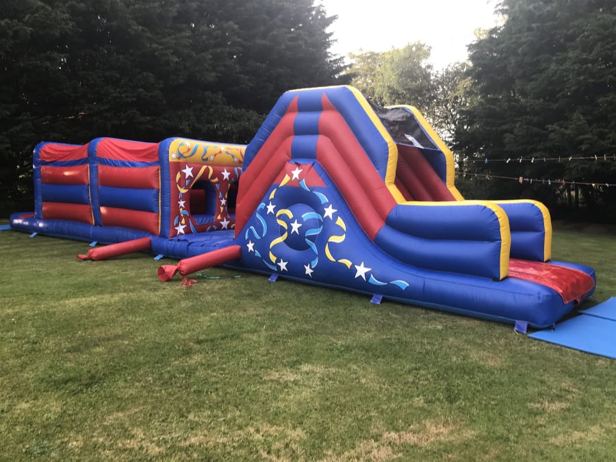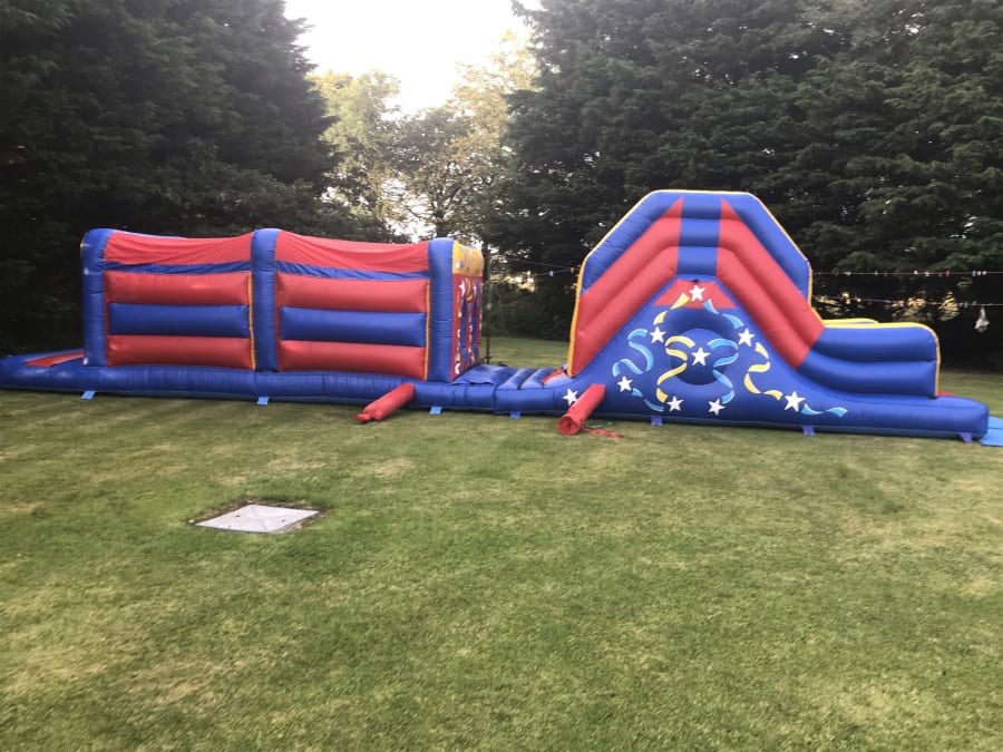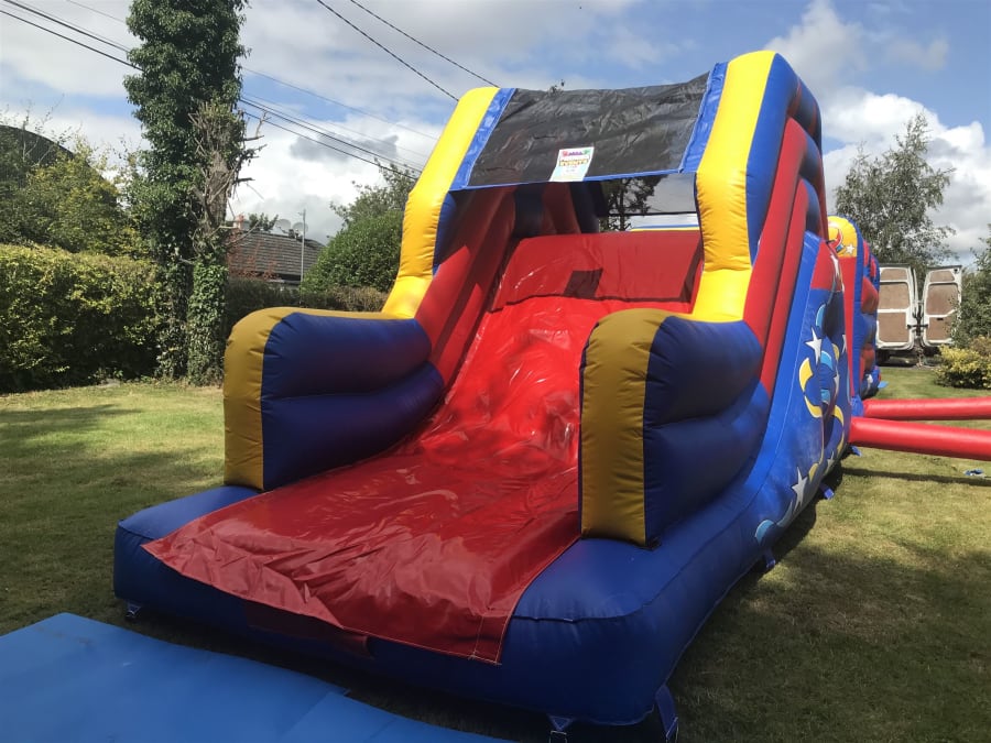 Our BIGGEST Obstacle Course boasting a massive 50ft! Like all our Obstacle Courses it has not only a bouncy area but a great size slide at the end of it to give it the best of both worlds. You enter the unit at the back through the tunnels before passing a series of inflatable pillars, through the tunnels and then faced with a 10ft high climbing wall up to the top and then slide down the slide. It also comes with a rain cover for showers